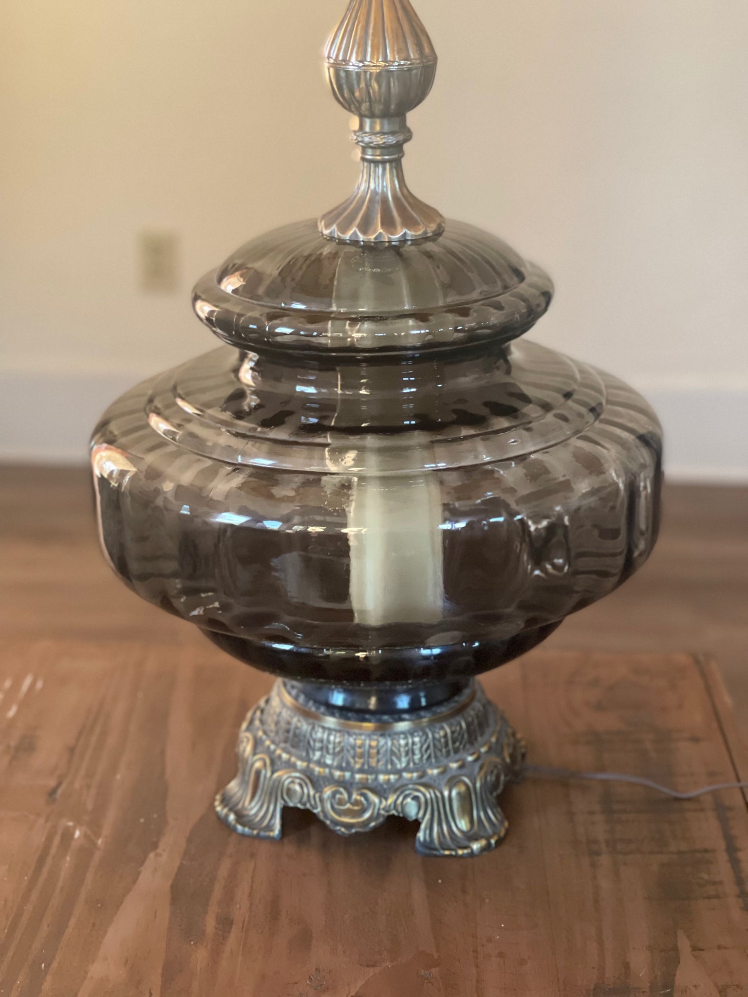Elevate your space with this stunning vintage mid-century modern table lamp, featuring a smoked gray glass base with elegant metal accents, reminiscent of Hollywood Regency glamour. Its distinctive genie-bottle silhouette and multi-tiered glass design make it a true statement piece, while the tall, tapered drum shade completes the sophisticated look. Perfect for adding a touch of vintage luxury to any room, this lamp captures the iconic style of the 1960s and 1970s.