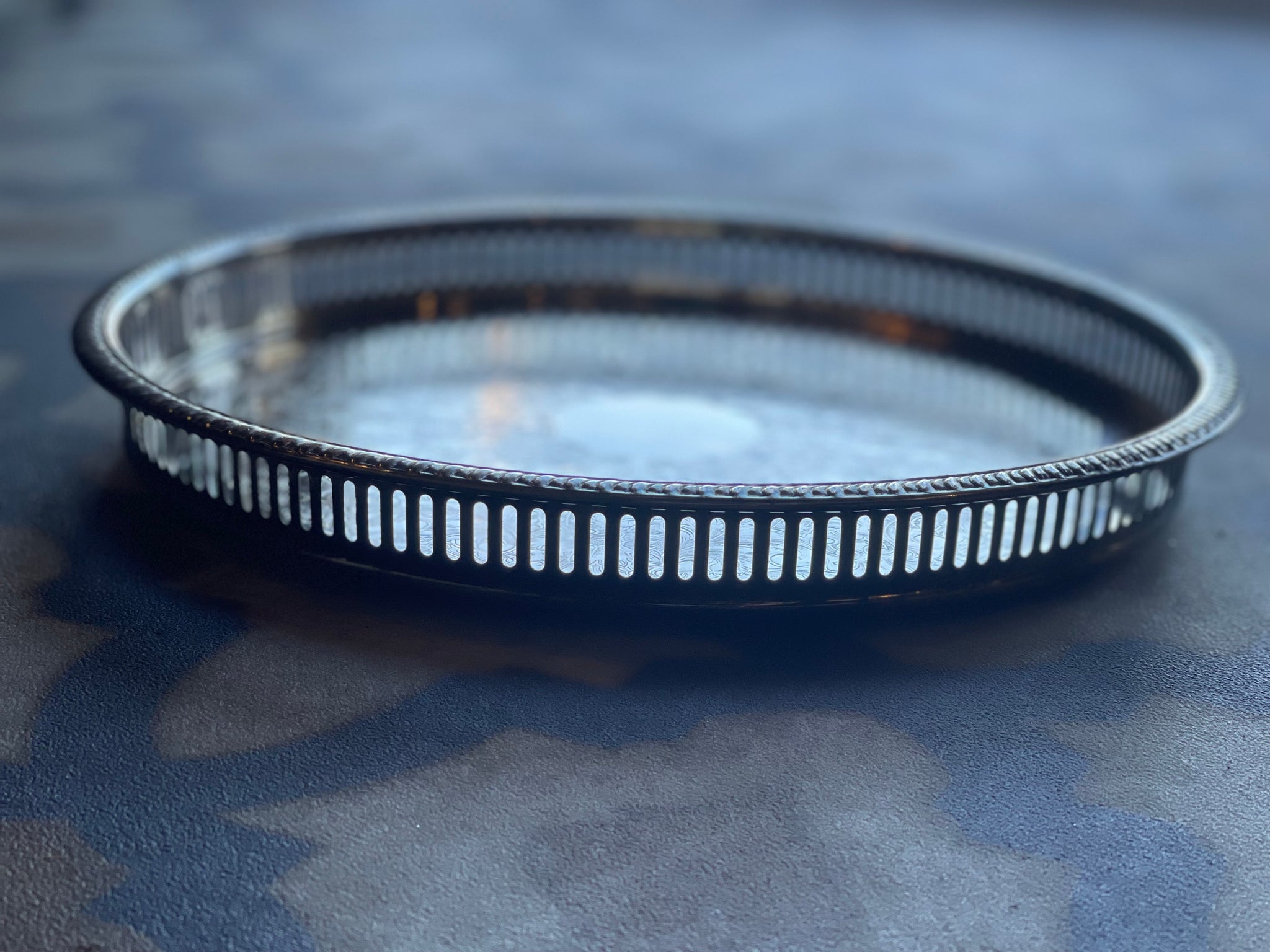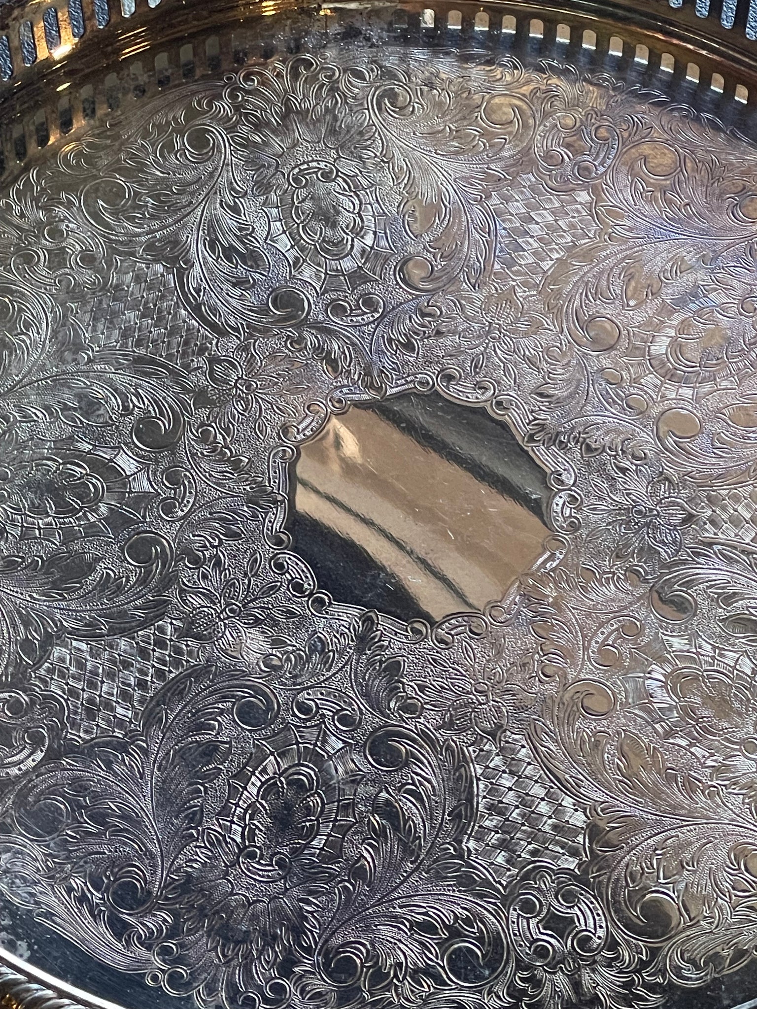 Featuring ornate floral etching in the center and a pierced or rope-style trim along the rim, this tray is both decorative and functional—perfect for serving or display.