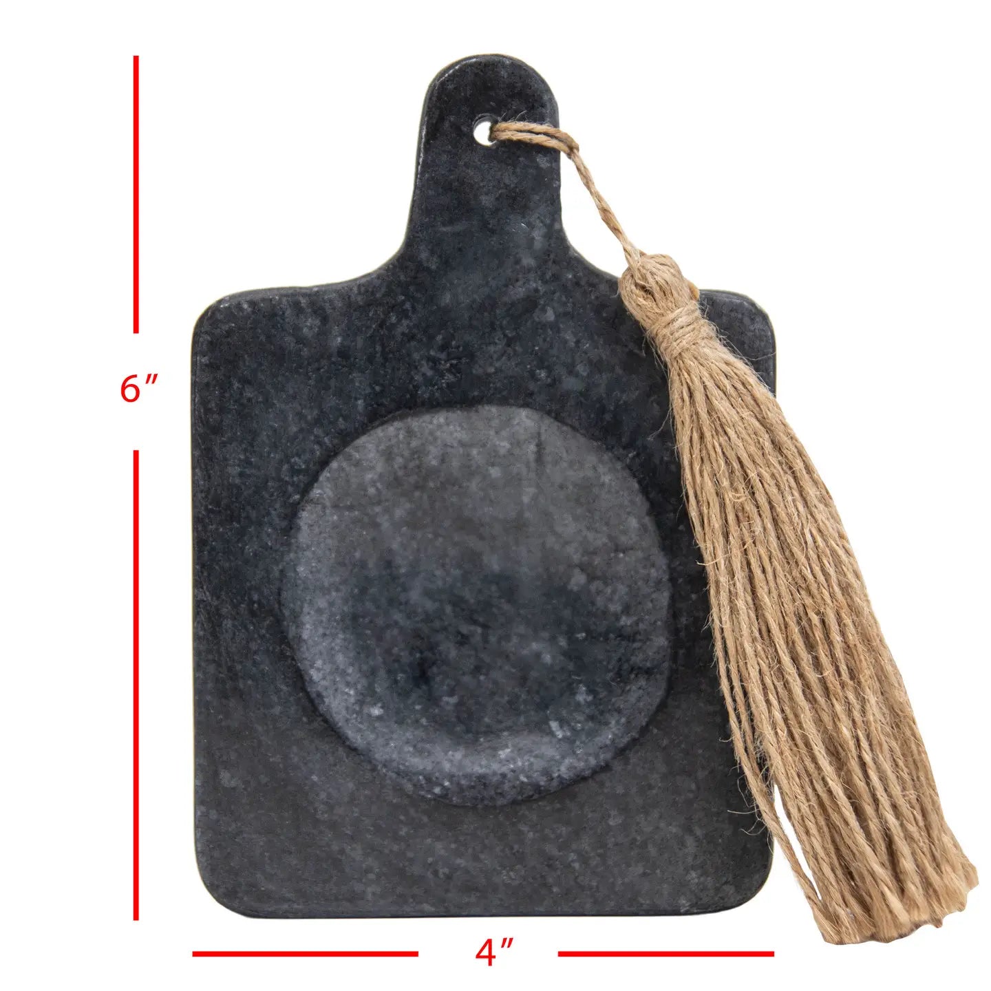 Simple and bold, a black marble spoon rest, inspired by the classic kitchen paddle board, solid black marble stone was crafted in that shape and finished with a delicate jute tassel.
