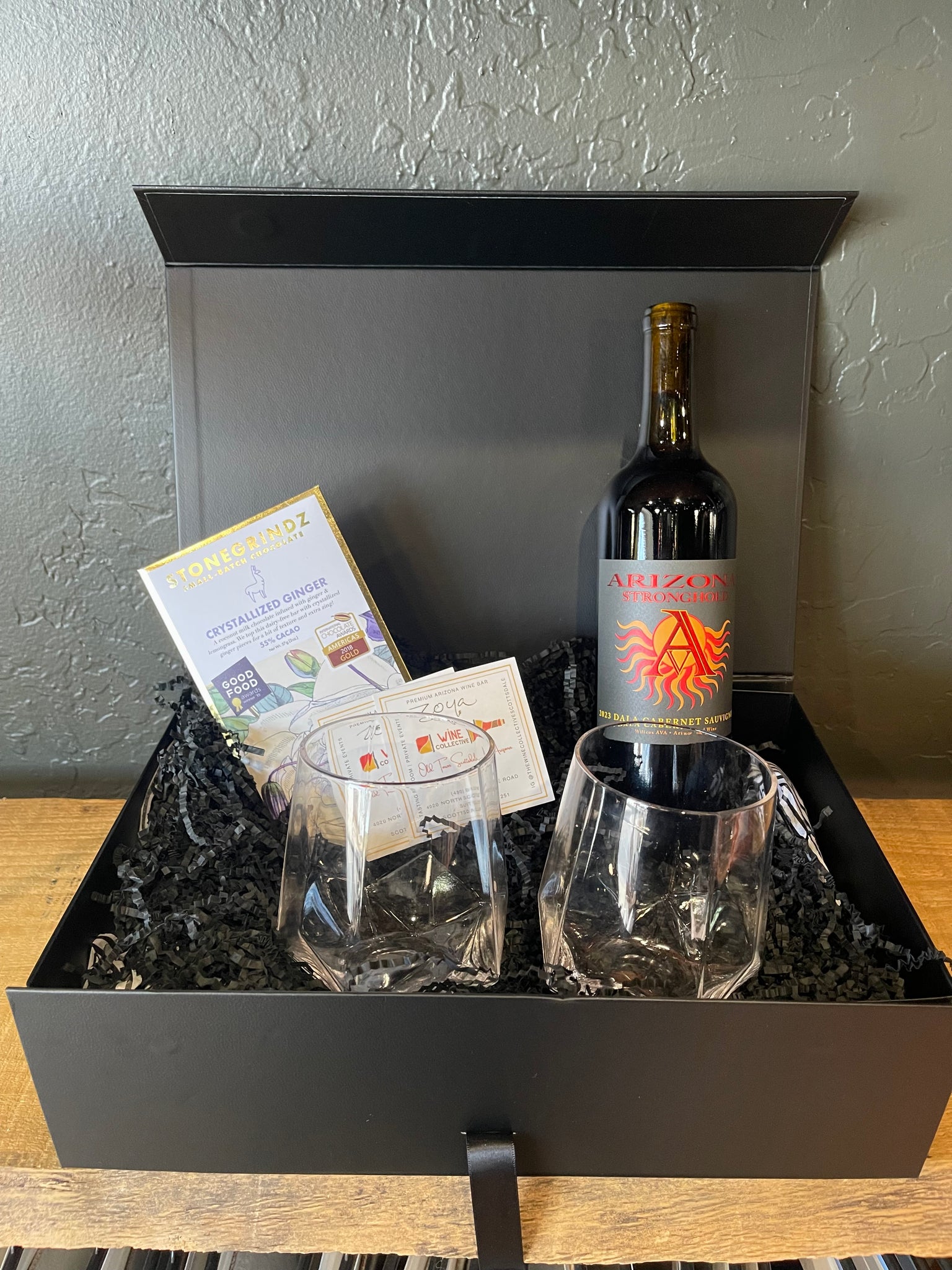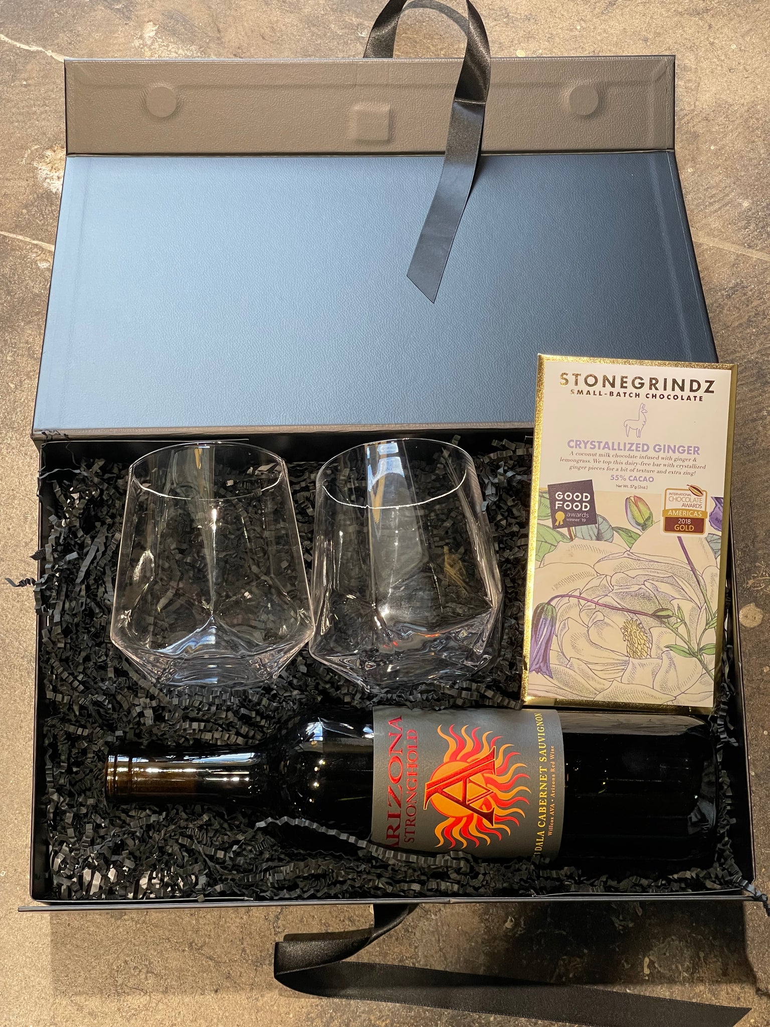 This elevated gift box pairs a locally crafted Arizona wine with a set of two crystal stemless glasses and a decadent, locally made chocolate treat — all beautifully packaged in a matte black box finished with a satin ribbon bow.